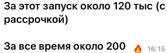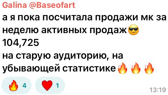 Мастер декупажа Галина @baseofart. Была уверена, что её творческие курсы и мастер-классы купили все, кто мог купить. По системе сквозных продаж за 2 недели заработала больше 100 000. Средний чек 3 500. Сейчас подняла ценник и покупают.