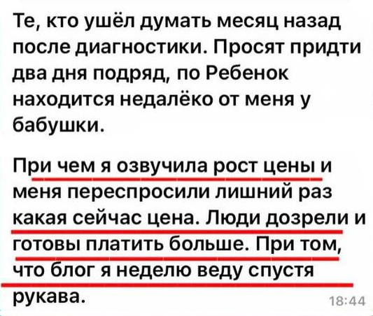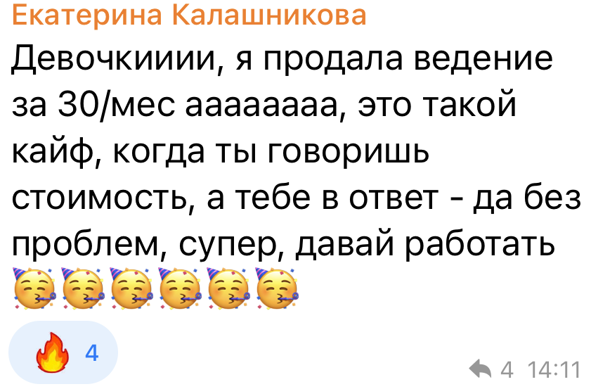 СММ-специалист Екатерина @kalsh.kt работала за 15 000 в месяц. Решила поднять цену. Клиенты ушли, сказав: “Дорого!” Подняла чек до 30.000 р ,пришли новые клиенты и сразу купили. Один человек сам попросился на наставничество.